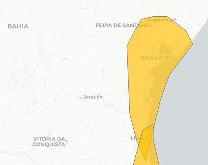 O CPTEC/INPE divulgou um alerta de chuvas intensas e acumulado de chuva para a área demarcada de amarelo no mapa acima: parte da Bahia. O aviso começou às 08:28h desta quarta (17) e tem duração até às 09:00h da manhã de quinta-feira (18).