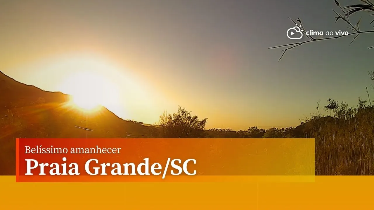 Um verdadeiro espetáculo da natureza! A câmera do Clima ao Vivo, instalada no Casa Nossa Restaurante Rural, capturou um amanhecer digno de cartão-postal em Praia Grande/SC neste sábado (13). A Capital dos Cânions amanheceu sob um show de cores, com o sol pintando de dourado as paisagens da serra. Para completar o cenário, a previsão é de um dia agradável, períodos de sol e nuvens, mas sem expectativa de chuva com temperaturas entre 8ºC e 19ºC.