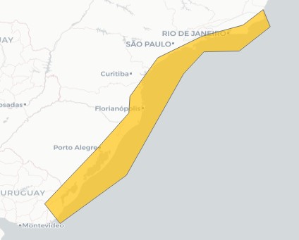 O CPTEC/INPE divulgou um alerta de ventos costeiros para a área demarcada de amarelo no mapa acima: todo o litoral do Rio de Janeiro, São Paulo, Paraná, Santa Catarina e Rio Grande do Sul. O aviso começou às 08:00h da manhã e tem duração até às 23:59h desta quinta-feira (09).