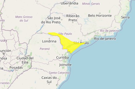 O INMET (Instituto Nacional de Meteorologia) divulgou um alerta de chuvas intensas na área demarcada de amarelo no mapa acima: parte do estado de São Paulo.