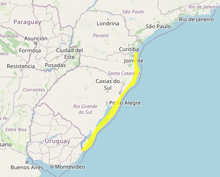 O INMET (Instituto Nacional de Meteorologia) divulgou um alerta de ventos costeiros na área demarcada de amarelo no mapa acima: litoral de Santa Catarina e Rio Grande do Sul. O aviso tem duração por todo este sábado (18).