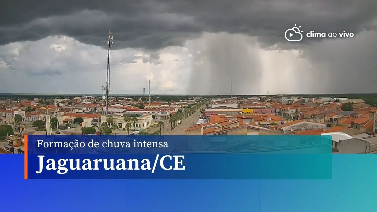 Registros captados pela câmera do Clima ao Vivo, viabilizada pela parceria com a Aicam Tecnologia, mostram a chegada da chuva em Jaguaruana/CE, nesta tarde de sexta-feira (10).