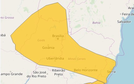O CPTEC/INPE divulgou um alerta de tempestade de raios, chuvas intensas e acumulado de chuva para a área em destaque no mapa acima: grande parte do Espírito Santo, Minas Gerais e Goiás, e parte do Tocantins, Mato Grosso e Rio de Janeiro. O aviso tem duração para toda essa quinta-feira (27).