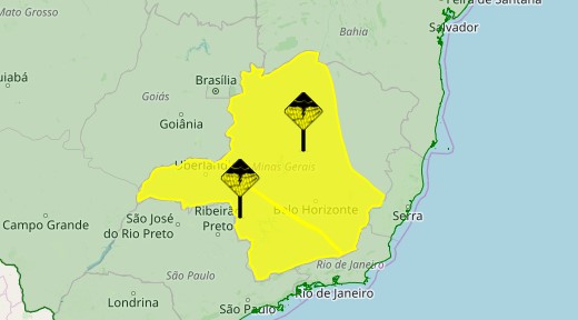 O INMET (Instituto Nacional de Meteorologia) divulgou dois alertas para chuvas intensas para a área em amarelo no mapa acima: todo o estado de Minas Gerais. O aviso tem duração até às 10:00h da manhã de sábado (21).