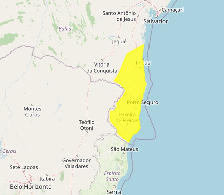 O INMET (Instituto Nacional de Meteorologia) divulgou um alerta de acumulado de chuva na área demarcada de amarelo no mapa acima: parte do estado da Bahia. O aviso começou às 16:00h de quinta (18) e tem duração até às 09:00h da manhã deste sábado (20).