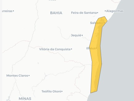 Já o alerta do CPTEC/INPE abrange uma área maior da Bahia. Confira: