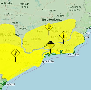 O INMET (Instituto Nacional de Meteorologia) divulgou vários alertas de declínio de temperatura nas áreas demarcadas de amarelo no mapa acima: todo o estado do Rio de Janeiro, grande parte do estado de São Paulo e parte de Minas Gerais.