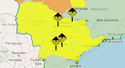 O INMET divulgou vários alertas de tempestade todo o estado de São Paulo e Mato Grosso do Sul, e grande parte do Paraná. O aviso tem duração até o fim da noite desta quinta-feira (20).